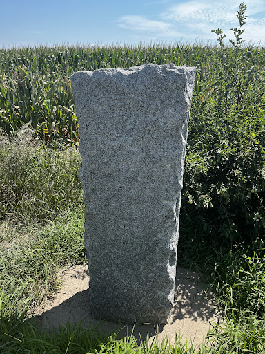 Stone marker on the side of the road. Grass around it is trimmed. No stories or...