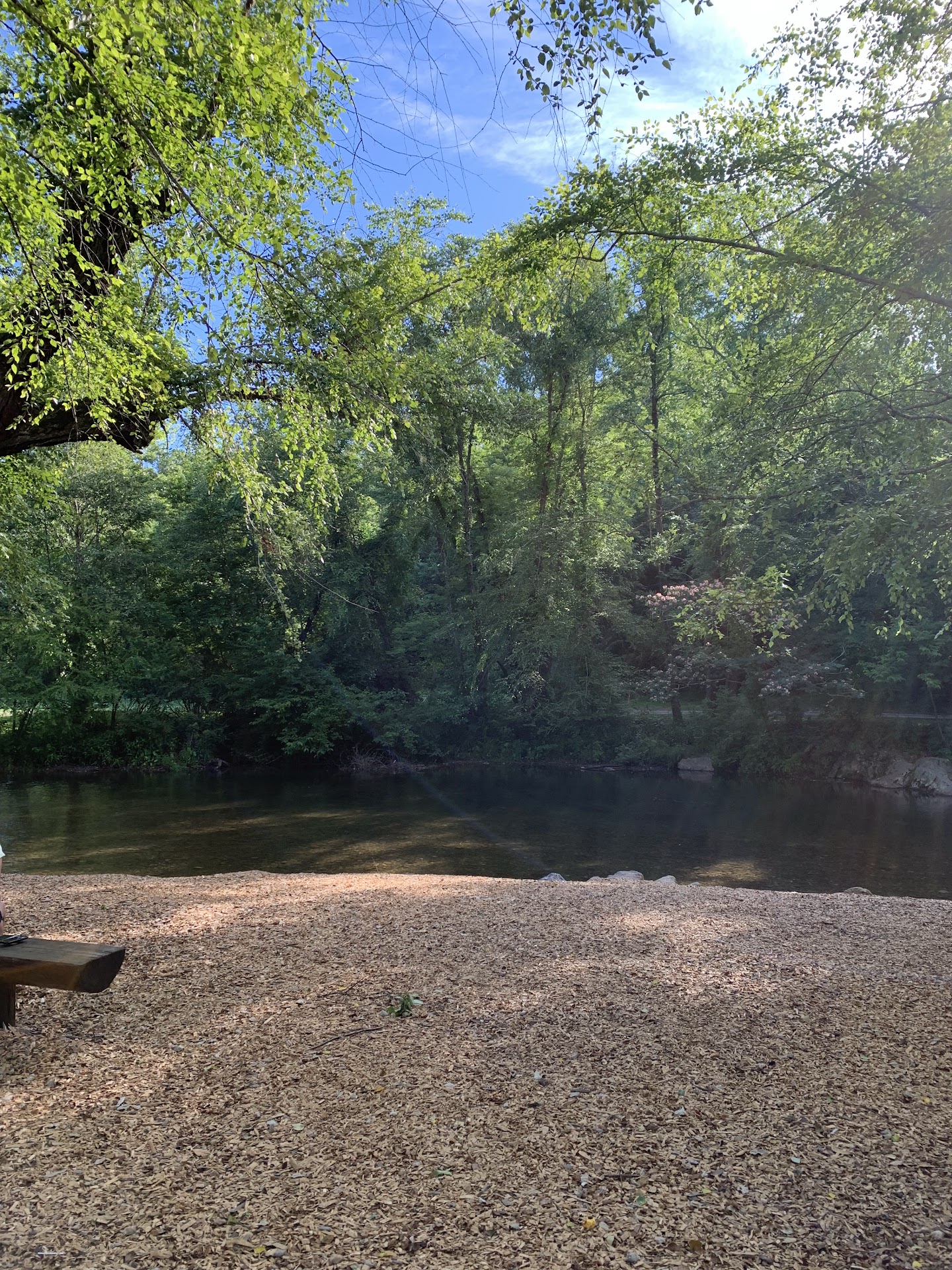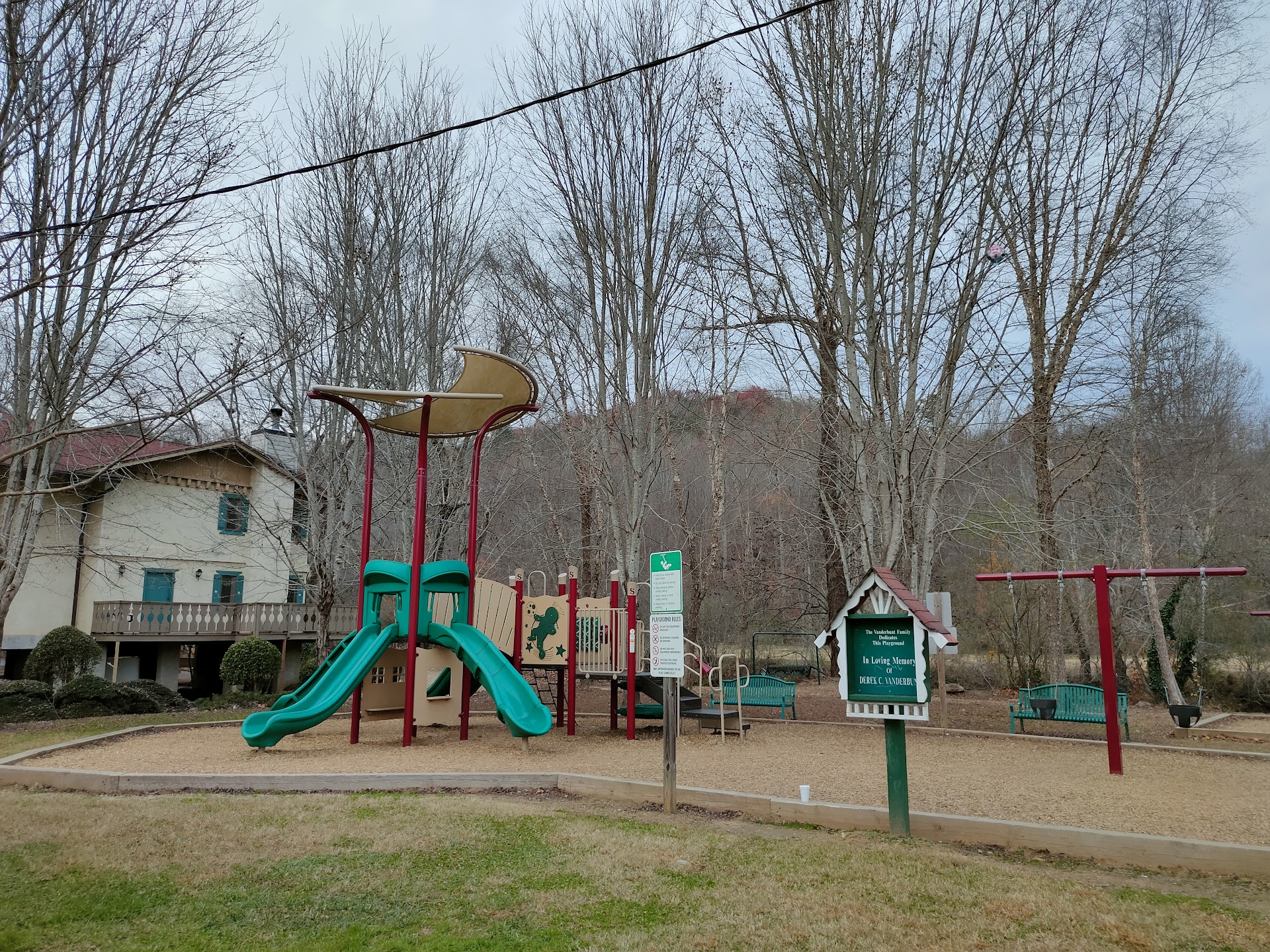 Nice little play area for kids ~2-12. It's right by the road, which is nice when you are walking through the city so you can just hop off the sidewalk and make a detour for your kids, but it's unfortunately not fenced in. There is a steep place you can step down to get into the river, and again no fence to keep kids from getting in, but there is a good distance between the river and the playground. They need to put sod out, it's mostly dirt outside the play area. There are a couple shaded porch swings, benches, and there is a neighboring building with public restrooms but they were locked when we visited, so maybe they are only open for festivals or during busy season. Watch out if it has rained recently, there's a few puddles around the playground and under the swings. Parking is a little further down the road, don't park at the rentals and get towed! If you found this review helpful, please give it a...