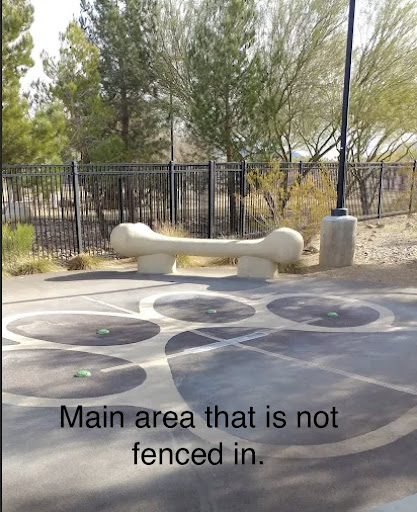 There is a large splash pad area, but itās not fenced in, so you canāt safely let your dog off-leash. Thereās also a very small fenced-in splash zone with two fire hydrants that spray water, but you have to keep holding a button for the water to work, and the area is mostly taken up by rocks, making it even more cramped.