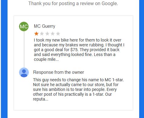 See the photo I uploaded. That was the first reply from the owner. As you can see, the owner is unprofessional and doesn't care about how customers are treated. Look back at my reviews. In no way are they all one-star. This owner had no reply to the substance of what I actually wrote.