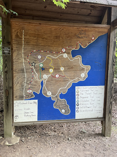 Has all the trails beside the building. Bill Laver Lakeshore Trail (1.8 mile loop), Fiddlehead Trail, Pine Thicket Trail, Dogwood Trail, Chickadee Trail, Raccoon Run Trail, and Wildflower Trail. All of these are accessible beside the building, heavily shaded, and great nature walks through forest type foliage and near High Point Lake's edge. The paved High Point Greenway begins at the parking lot too.