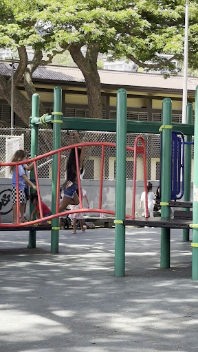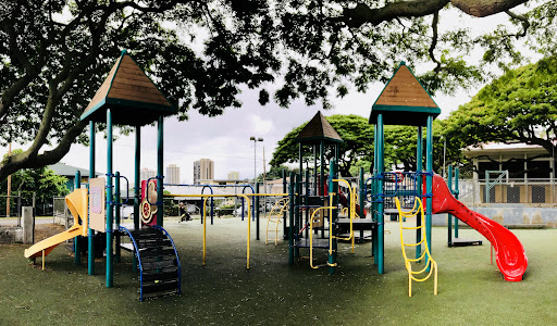 It features a fenced-in playground which was recently remodeled this past summer. Kids are able to play safely with the cushioned asphalt. Moms and Dads are able to relax on the cement benches under the shady Monkey pod tree.