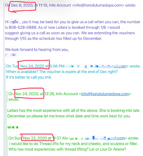 And,,,there is another issues. Poor customer communication. Reception is not quick response at all. Sometimes not responding for very long, either email and text. At the longest was no response 14 days after bought $500 voucher through online on Nov and tried to make an appointment. Voucher expiration is at the end of Dec but she said all slot was occupied with last mail. (Picture attached) Maybe too busy to sold too much anniversary deals and fully booked. Btw just ācall usā to make appointment was the answer after 14 days. Lol. Actually it was after I went there and had treatment she even didnāt check.