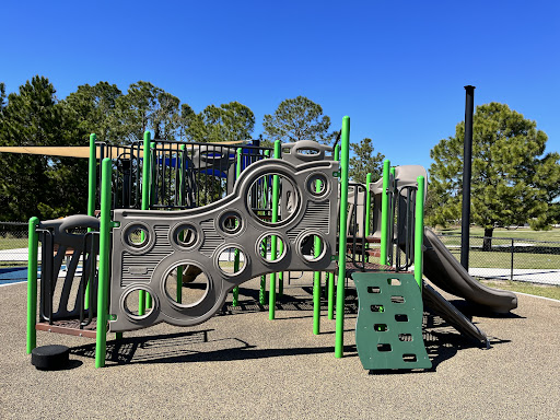 We have been coming to this park for two years. The playground has a fence enclosure to keep the little ones safe from wandering. There is one sun sail coverage for the play area for the kids 5-12 and the toddler playground has no shade coverage. The playgrounds have slides, climbing structures, ramp accessibility, stepping stools, and interactive sensory stations with music and sounds. An adult fitness area is outside the fenced playground area and also has a sun sail for shade coverage. There is a covered pavilion with two picnic tables but there are no bathrooms. This park features a large field for soccer and is great for flying a kite on a breezy day. There are sidewalks for roller skating, skate boarding, scooters and biking.