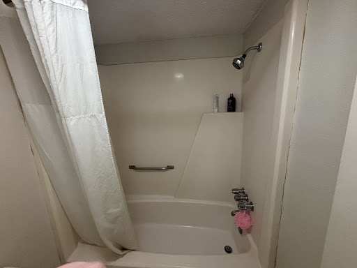 The room that they tried putting us in when we first got here had a hole in the ceiling of the bathroom that was covered with plywood. We went up to the front desk and asked if we could just check out and get a refund but they ended up getting us a different room that’s cleaner and much better than the first one they put us in. The fact that the shower is so short that I (5’5” female) had to duck down to just wash my face and rinse off my shoulders is kind of annoying. The door to the bathroom drags on the floor so it’s hard to use the bathroom without scratching the floor and making noise. Me and my husband both agree that we won’t be booking here again just because we want to be comfortable and be able to take a proper shower. I’m attaching a picture of the shower so you can see I’m not bluffing.