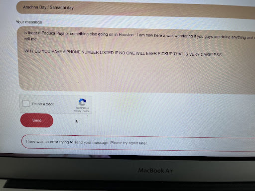 Not responsive no one picks up the phone. 8/1:2023 Update went to their website. It’s very static and lame- not much current info on it. Tried to send message for info under their Contact Us tab and it errored our many times see attached pic. So a cultural that prides itself on knowledge especially IT in this age. Have such a nir even 3rd world but 5th world website. A phone number that does not work. I recently moved here and wanted to know if there are event for Gurudev’s Aradhna day but I cannot. I live quite far and Di not want to do a useless drive. People did say it’s like a private club, if you are part group you are in or you are not. Not too friendly to outsider. That may be the reason they make themselves so inaccessible. All other temples, much smaller have been more responsive. MAybe not right away but they call back. SO SAD this location Chinmaya Missions Houston is so non- responsive. On 3 different countries I have had better experience. The NJ place used to have this issue but got fixed after Guruji visited. Going to NJ for Swamiji Swaroopananda visit maybe if get some time with him will let him know. He is just so ways for cool.