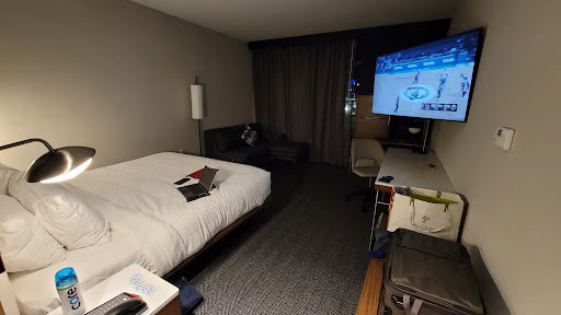 The hotel looks and feels new and is very spacious so does not feel cramped nor compact. The size continued into the room as the rooms are also spacious and very comfortable. As you enter the room, on the right side was the bathroom and the closet. The closet contained a place to hang clothes as well as the iron and ironing board. The bathroom was very spacious and contained a sink, a toilet and a shower. Bathroom toiletries included a bar of soap next to the sink and refillable body wash, shampoo and conditioner in the shower; there was no lotion available in the hotel. Further into the room, on the right side were two large double beds with a nightstand in the middle. The beds were spacious, very comfortable, and provided a good nights sleep. The nightstand in the middle had small lamps above and power ports and an alarm clock. There were also outlets on either side of the bed but not many lights - that was the only negative about the room was the lack of lighting. In between the bed and the large window was a chair and a lamp. Across from the beds was a luggage storage place, a nice large desk with power ports, and against the wall was a cupboard with a fridge on one side and on the other side a microwave on top and ice bucket and coffee machine on the bottom. The main advantages of the room was the spaciousness of the room - nothing felt cramped nor tight - and the plethora of amenities in the room.