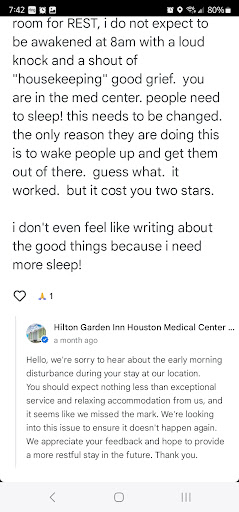 FIRST REVIEW...you had me at hello, and you lost me at goodbye. when i pay 150 for room for REST, i do not expect to be awakened at 8am with a loud knock and a shout of "housekeeping" good grief. you are in the med center. people need to sleep! this needs to be changed. the only reason they are doing this is to wake people up and get them out of there. guess what. it worked. but it cost you two stars.