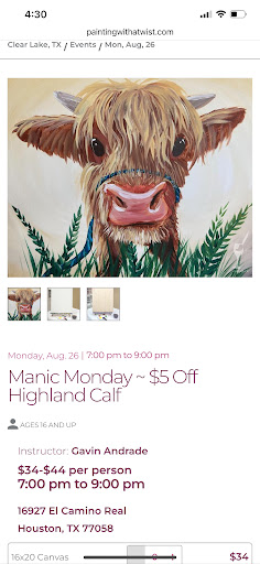 Read moreAlright. One of my sisters and I have been to this location before. The instructor was amazing, she walked us through step by step, came around and offered advice….the instructor we had tonight was TERRIBLE. The only instruction we received was when to mix white with the other colors and what section we were on. He (Gavin) finished the painting and walked away. We started 30 min late because he wasn’t ready for the three of us (there was no one else in the class). At first I thought wow, it states they won’t do a class is there are less than 4 reservations, this is great - no. I have done painting with a twist numerous times and this was the worst experience I’ve had. It showed in the lack of guidance provided. I am beyond disappointed. We caught numerous steps that were skipped and called them out (he blamed it on the instruction). The first photo is what was advertised - while I do not expect an exact replica….the second was the instructors. Then obviously the third is ours. I just can’t express how upset I am with the lack of instruction and professionalism we received tonight. We started just following the photo that was displayed versus following the instructor. Honestly, doubt we...