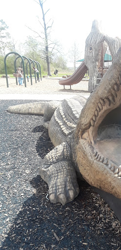 This park is so nice. Would of earned my 5 stars if it was gated because there are always stray cats and dogs here. Plus it needs parking there are a good 10 spots and everyone else needs to park on the street. However, really cool for kids and adults. There is a Flintstone looking area really nice and shaded. There is a workout area, a few swings for kids 1 And up. Love the seating for parents just wish it was more shaded. And how awesome there is a alligator statue with its mouth open where you can sit and take pictures! There is a water area but I've never seen it on. And a few slides and steps to climb that resemble logs of a tree. The is a hige cave kids and Adults can walk through. The ground is very soft in this area as well as near slides and swings. Also, a basket ball courts with 4 hoops. There is also a field large enough for 2 games of football, a game of soccer, and a volley ball game if you'd like. There are no bleachers, or tables, nor goals, or cones, nor volleyball net but just having the open field makes the possibilities endless. There are apartments just cross the street if your looking to live...