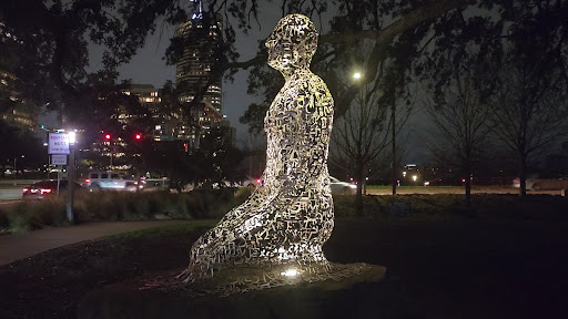 Read moreThis Alpha-guy is one of seven Alphabet Men that kneel quietly looking out from Buffalo Bayou Park onto Allen Parkway. The statues that are made up of stainless steel letters each represent one of the seven continents. The letters are selected from several different languages. These six-foot statues rest on large stones imported from Spain where the artist was raised. Jaume Plensa, the sculpture said that his father had many books and loved to read – So, he grew up in a forest of letters. It is worth a trip to Houston at night to see them (Named -- “Tolerance”) lit up under the canopy of these live oak trees. Thousands of people drive, walk, run or cycle by these Alphabet...