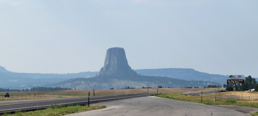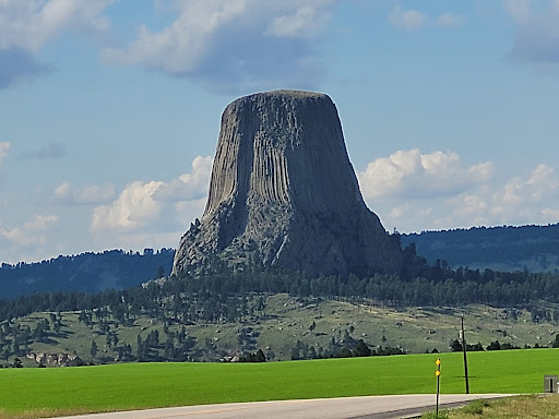 Beautiful views of Devils Tower from here. The text reads, "Devils Tower, an important landmark for Plains Indian tribes long before the white man reached Wyoming, was called Mateo Tepee, or Grizzly Bear Lodge, by the Sioux. A number of Indian legends describe the origin of Devils Tower. One legend tells about seven little girls being chased onto a low rock to escape attacking bears. Their prayers for help were heeded. The rock carried them upward to safety as the claws of the leaping bears left furrowed columns in the sides of the ascending tower. Ultimately, the rock grew so high that the girls reached the sky where they were transformed into the constellation known as the Pleiades. Fur trappers may have visited Devils Tower, but they left no written evidence of having done so. The first documented visitors were several members of Captain W. F. Raynold's Yellowstone Expedition who arrived in 1859. Sixteen years later, Colonel Richard I. Dodge led a U.S.Geological Survey party to the massive rock formation and coined the name Devils Tower. Recognizing its unique characteristics, Congress designated the area a U.S. forest reserve in 1892 and in 1906 Devils Tower became the nation's first national monument. Rising dramatically to a height of 1,280 feet above the Belle Fourche River, Devils Tower has become a rock climbing mecca. On July 4, 1893, local rancher William Rogers became the first person to complete the climb after constructing a ladder of wooden pegs driven into cracks in the rock face. Technical rock climbing techniques were first used to ascend the Tower in 1937 when Fritz Wiessner conquered the summit with a small party from the American Alpine Club. Today hundreds of climbers scale the sheer rock walls each summer. All climbers must register with a park ranger before and after attempting a...