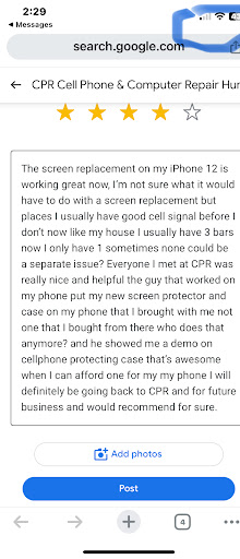 The screen replacement on my iPhone 12 is working great now, I’m not sure what it would have to do with a screen replacement but places I usually have good cell signal before I don’t now like my house I usually have 3 bars now I only have 1 sometimes none could be a separate issue? Everyone I met at CPR was really nice and helpful the guy that worked on my phone put my new screen protector and case on my phone that I brought with me not one that I bought from there who does that anymore? and he showed me a demo on cellphone protecting case that’s awesome when I can afford one for my my phone I will definitely be going back to CPR and for future business and would recommend for sure.