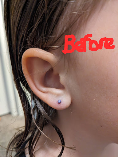 Read moreMy oldest got her ears pierced at Claire’s almost four years ago. One ear was and is fine, and has given her no issues. But the other one randomly and unfortunately snagged on a mailbox the day we got it pierced, and we went out of town for a week immediately following so they couldn’t re-do it until a week later. I can’t speak to their placement the first time, but that second time they pierced way too low AND at a downward angle, and it has had issues with infections multiple times ever since (weirdly just the one side). We finally said enough’s enough, let it seal closed, and went here to Sacred Alchemy to get it re-pierced.