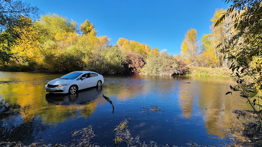 I am surprised at how much is fit behind the expectation of this little park! It seems simple but there is the obvious park area that has nice grass and a pavilion with benches, and then there are camp grounds, mountain bike trails, a frisbee golf course, fishing (I think), as well as walking trails and I've seen people riding razors and atvs around! Some areas through the river are deep enough for swimming and other areas are shallow enough for some fun off-roading! We have brought our dog here multiple times and he loves it. There are often a handful of dogs that we see when we go. The road that goes along the camp sites is very accessible to all vehicles. We even took our Honda civic into the river in a shallow area for fun, but nothing crazy! Haha