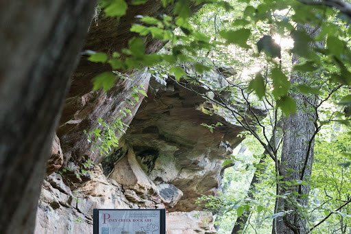 This is a very interesting and beautiful place to visit. Access is easy from Route 3 southeast of Chester, IL, and Google Maps will guide you through the couple of turns that you need to make. All roads are paved until you get within about a half mile of the parking lot, then it changes to gravel. The parking lot is partially gravel and partially grass and large enough for ten vehicles or so. The quarter mile hike from the parking lot is via a wide mowed lane between two fences and is slightly uphill. After turning right you will soon encounter a sign welcoming you to the area. At this point the trail splits with the right-hand path taking you on top of the ridge, and the left-hand path descending into the ravine and leading to the petroglyphs and pictographs. We took the latter and did not walk the whole trail that circumambulates the area. This latter trail descends and crosses a branch of the creek then rises again, goes parallel to that branch, and descends once again to cross the main Piney Branch of Mill Creek. It had been very dry for weeks when we were there, so we had no trouble with either creek crossing. After the second crossing the trail leads to a sandstone bluff, then along the base of the bluff to a point where you will find a large sign explaining the petroglyphs and pictographs. I would describe this trail as being of "moderate" difficulty, not easy but not challenging either. A walking stick of some sort would be handy for the second stream crossing that is made on rocks that can be slippery and wobbly. The rock "art" is certainly interesting, especially considering that some of it dates back over 1500 years. After your visit to the ravine you can head over to Chester to check out the work of Elzie Segar, creator of Popeye, Olive Oly, Wimpy, and the rest of the Thimble...