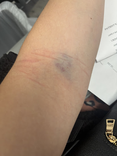 Ā Ā Ā Read moreI arrived Friday for a blood draw/urine sample, and was pleased with the friendliness/helpfulness of the lady at the counter. I was handed a cup, and told to handle business then pick an open stall for a blood draw. I chose Karina, since she was the only one available. Karina was less-than-enthusiastic, and her attitude was off-putting. I mad a simple request to have my blood drawn from my hand or outside of my arm, as I've had it done that way for the last 20 years. Karina argued with me immediately about the location request, and repeatedly and FORCIBLY attempted to turn my arm over to stick me, against my will, saying she could "see a good one right there!". My arm was shaking from holding it away from her, as she wouldn't listen. I called out for someone else and asked for someone new to draw my blood. Karina said "no no no, fine I'll do it" (she also refused me a smaller needle/butterfly) and proceeded to jam the needle in my arm saying "See! It doesn't work!" while smirking. Once she pulled the needle out a little, the blood ran smooth and fine. After that blood was flowing without an issue, Karina kept pulling the needle in and out, and digging all around/jiggling the needle. She was arguing with me this entire time saying she might look young, but she knows what she's doing. I asked her why she was jiggling the needle all around when it was flowing smoothly. She stopped after I said, "boy you're trying to leave a fat bruise, huh?". I was in such shock at her abuse, and I cannot fathom having such a liability working for you. I am not a stranger to blood draws. Shouldn't one focus on the patient and blood draw instead of giving attitude and trying to argue with a patient? More so than maintaining their ego? She kept it up as I was leaving too, with the snide remarks and passive-aggressive behavior. I'm even worried about the validity of my samples and hoping nothing was tampered with. She should never touch another patient. How dare you abuse someone with a needle in their arm. I will be reporting her elsewhere. She left my arm sore and bruised. Update: Been 2 weeks, still have a bruise but...