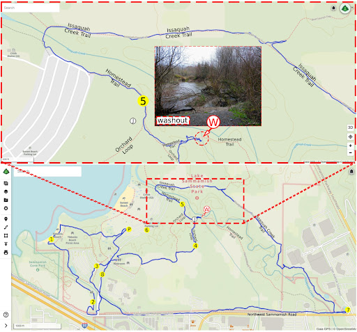 Perhaps, this section of Trail between (6) - (7) is "un-maintained" (because it is out of Lake Sammamish S.P. property line?).