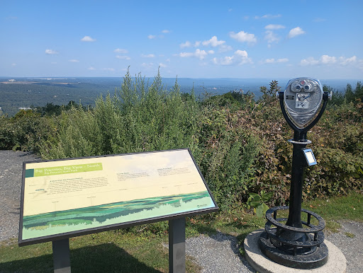 Comprehensive Review: Great vistas in all directions. I visited in June when the area was full of mountain laurels in bloom. Driving up Camelback Road you'll see a parking area off to the right. This is one of several lots for hunting in the park. Across from the park sign there's a way to access the 3 mile south hiking trail, one of four longer trails in the park. Just before Loop Road Is the top of the ski lifts for Camelback resorts which has a lease with the park. And nearby is the Summit House restaurant with its breath-taking views from the mountain. This brings you to a road that circles around the top of the park. Appropriately named Loop Road, from here you'll see small vistas between breaks in the tree cover. Two small trails will take you through the trees to much better views. In the center of the loop is a road with several features. There's an airlift field for emergencies and a fire tower. You'll also see the Cattell Cabin built in 1908. There's a sizable parking lot at the end and a non-flush bathroom. From here you can hike or bike, but bikes are only allowed on the paved roads. Horseback riding is allowed on both paved roads and trails. This section has multiple learning boards, mostly about the numerous bird species attracted to this area. One spot has a viewing scope to get a better look at the vista. Picnic tables with charcoal grills and a few benches to sit and reflect are scattered about. There are many other activities nearby outside the park, and there's even a dinosaur!
