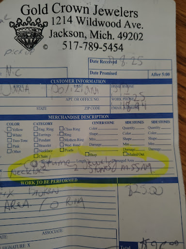 Read moreWe have brought 2 very special family heirlooms to Gold Crown Jewelers (on separate occasions) they did a fantastic job with both! Fair pricing too! A very old and treasured wrist watch, gifted down from 4 generations. The watch was in need of refurbishing, as it didn't keep time or wind up. It also needed a good cleaning. The watch took about 2 weeks to get back to us and it was great in every way! There is a personal engraving on the back of the watch and I told the repair guy to please be careful to leave the engraving unscathed during the cleaning process, and they did just that! A 3rd generation bridal set we brought in for resizing and inspection/repair. The ring had to be sized from a 5 to a 7 and the points on the main diamond setting were completely worn off. We got the ring back in about 10 days and it came back with more brilliance than it went in with....