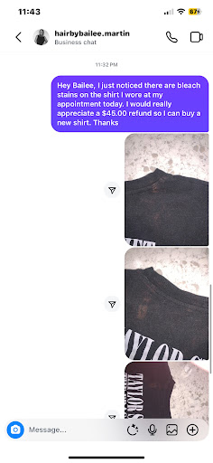 I had an appointment with Bailee on December 14, during which she colored my hair and did a great job. However, upon returning home, I noticed that my shirt had gotten bleach stains on it. I reached out to Bailee to express my disappointment and requested a refund of $45.00 to cover the cost of my ruined shirt. The total for my appointment amounted to $287.50, which included a $50 tip. Bailee read my message but did not respond. I followed up the next day, yet she still did not reply.