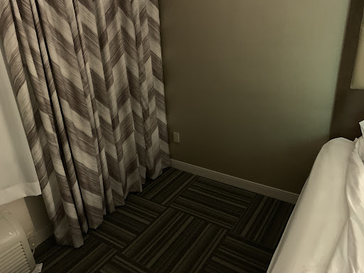 I advised Jay, at the front desk, of the problem. She could not unplug the lamp, because its cord was threaded through a hole atop the nightstand to a wall outlet and the outlet itself was behind a panel of the nightstand and was hard to reach. She and I together were able to get it unplugged. Her attitude was outstanding.