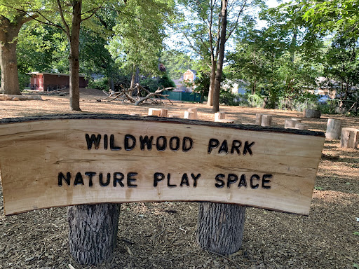This playground at Wildwood Park is a wonderful and quiet playground tucked away in a residential neighborhood. There are two main areas to the playground - a smaller area for younger children and a larger area for older children - as well as a new 'Nature Play Area' next to the play area. The play area for smaller children includes a small play structure, a spinning saucer, and a set of panels for imaginative play. The area for older children includes a large play structure with slides, climbing features, and a large metal traverse element. Between these areas is a small set of swings.