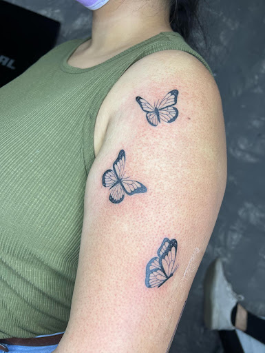 i genuinely loved my experience. i was with claudia for 3 butterflies and a stamp with a sampaguita in it, each piece around 2x2 in size. in total, it took abt 2.5 hours from when she drew the pieces, put the stencils on, and finished the work. she was so helpful esp when i was unsure of sizing and placement, and was very patient with me when i kept wanting to change things. she was very kind and kept checking in on me. this wasn’t my first tattoo ever but it’s the first time ive gotten more than once at a time, and i thought id need more breaks or that she would, but we powered thru fr. like when i tell yall that claudia’s pressure, speed, and skill didn’t AT ALL get worse as we went on…. it’s like she has robot arms it was so good!