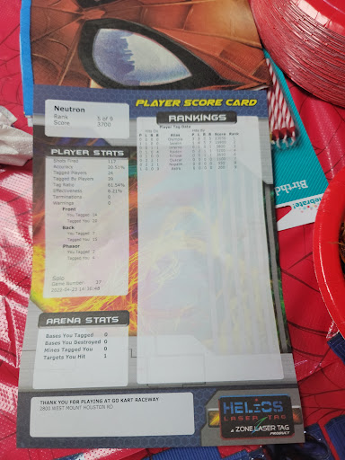 Read moreIt was fun at first. Then, the rain came and we didnât check weather, nor did we read a sign that said no refunds due to incline to weather. I also had $40.00 cash that I had to give to someone that needed it, problem is it fell out of my pocket, along with my phone and air pods. Phone was at the front, and AirPods stayed in the cart, my $40 that was all together in my pocket along with formerly mentioned items, was missing. Iâll never know what exactly happened to that cash, but I wanted to at least get $40.00 worth of my âKartâ tickets back in cash. They were very stern on not helping me out with that, and I donât like that rule. If theyâre so adamant about it, They should at least verbally advise others, ââŚno refunds due to inclement weather⌠the weather app show itâs gonna rain soon you should consider this but buy tickets at your own risk...â or just not sell the tickets cause no one wants to have money gouged from them like that. I just wanted my family to have fun on go karts. I went to play laser tag later we were told it was a free for all, and there was a team of kids against me and my wife, the kids were super happy to kick my butt. But thatâs about the only happiness I could offer, and my poor daughter was waiting for her turn to get on. Just heed my warning and...
