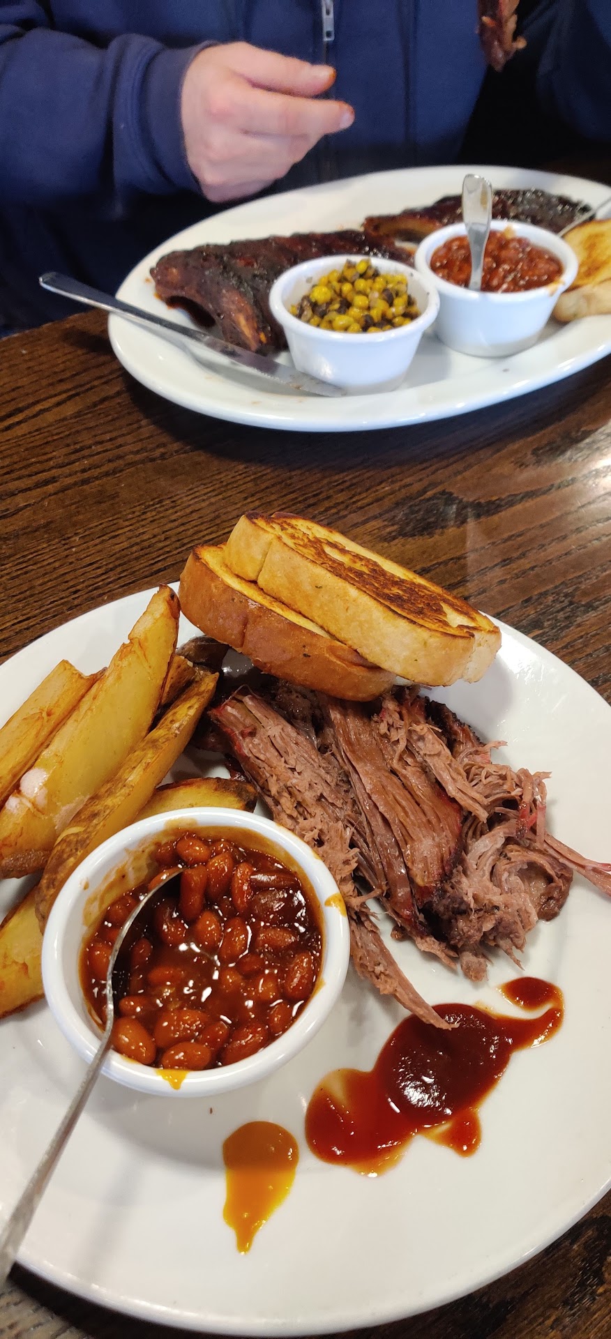 I had the pulled pork platter with fire roasted corn and baked beans. The corn was very good, exactly as advertised. No extra sauces or added vegetables, just nicely charred corn. The baked beans were fine. The pork was a completely blank canvas for the selection of sauces at the table. It might as well have been boiled. No smoke, no seasoning, no flavor at all. If you get pulled pork to carry the BBQ sauce, this would be perfect for you.
