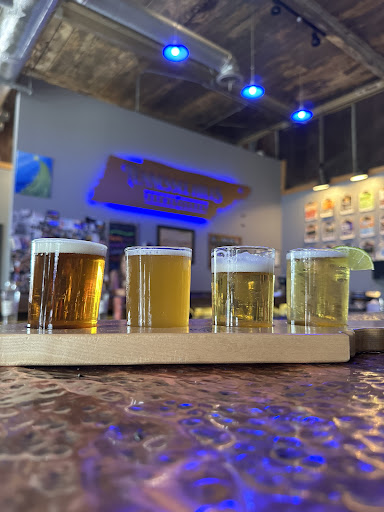 First impressions: from the industrial gray facade with hints of warm distressed wood, both the exterior and interior of the building, are a blending of urban chic and Tennessee authentic pride in it’s moonshine soaked roots. The outside has Tennessee Hills branded bench seating under sail shaped sunshades, cool vintage cars and trucks and a great outdoor sound system. There is a small stage area for live music outside, and out back, a much larger venue. The interior is filled with unique decor, like the hand beaten copper bar top over whiskey barrel siding that surrounds the bottom of the bar. The huge handmade iron Tennessee Hills logo, with unique lighting, dominates the rear wall behind the bar. Vintage prohibition age photos and decor throughout the interior is well throughout and is married with exposed metal beams and carbon gray paint. Above the bar is an enormous iron chandelier with multi tier bottles of the different small batch liquors that Tennessee Hills Distillery make and sell. The combined effect creates an urban polish to Tennessee Hills fabled bootlegging history. The Brewstillery has some of the very best craft beers overseen by the brewmasters, who take pride in producing a wide variety of good beer, from summery IPAs to heady dark brews, there is something for every beer lover. All in all the Brewstillery has a relaxed, chill vibe that is both unique and fun and is a ‘must go’ destination, when visiting...
