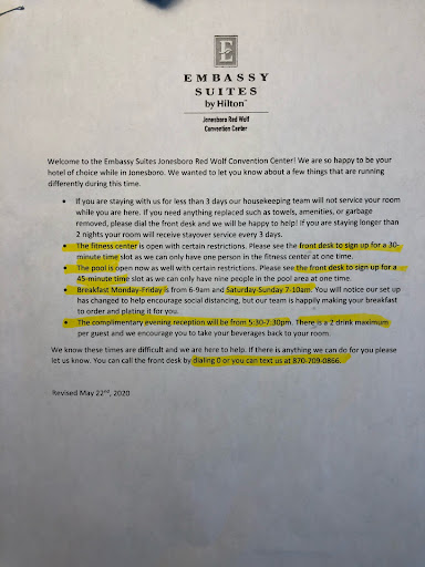 I recently stayed at the Embassy Suites by Hilton on the A-State campus in Jonesboro, AR, for four nights with a group of six guests. While there were several positive aspects of our visit, I wanted to share some concerns regarding our experience that I believe warrant your attention.