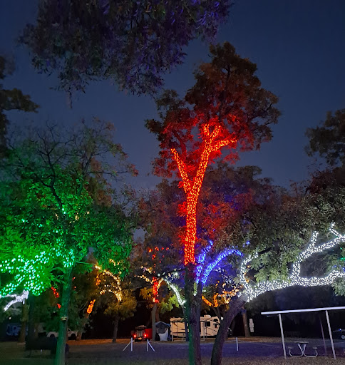 This park is a jewel! It's a free place to camp for up to three days. The sites are level and large with picnic tables and grills provided. And the local people are as accommodating as anyone could want. We arrived about an hour before dark and, while trying to decide where we would set up, a man in a truck pulled up bedside us, got out and approached. He identified himself as being responsible for the park. He informed us that there are no hookups (we had read that online) and that the bathrooms are closed (for obvious reasons). Lately, with seasonal high winds, several pecan limbs have fallen in the park. He warned us to park away from limbs that might fall onto our rig. He also made us aware of the seasonal displays that attract locals to drive thru the park after dark and invited us to fully enjoy the facilities. There is currently a drought in this part of Texas and some people had been using the free water from this park to supplement their supplies so the park has had to outlaw hose hookups to any spigots within the park. We carry our freshwater supply which we get when we fuel at truck stops and we run a generator, when needed, to supplement our solar system. We create no black water so we have no need of sewer hookups. There is a spillway on the river which runs adjacent to the park. The sound of the water is soothing. This morning, when we went out around 8am, there were three deer crossing a shallow place in the river and coming straight at us. Even when they saw us, they kept to their path and ran within feet of us as they crossed this small peninsula and disappeared into some trees. We would love to return here if our...