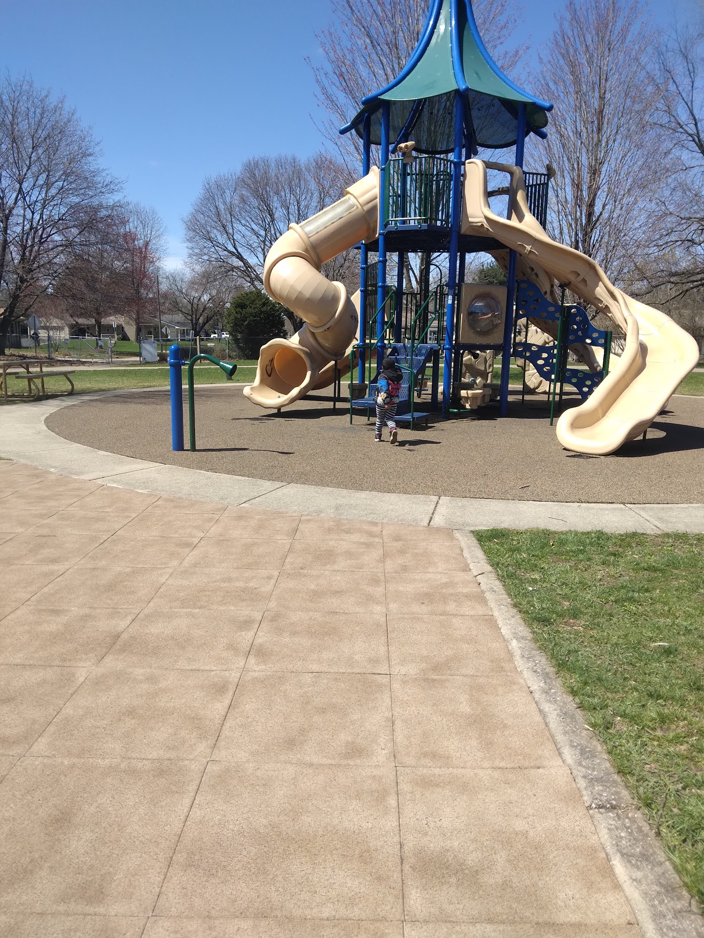 This park in Kzoo's Westwood neighborhood provides 11 acres of well maintained green space with both open areas as well as mature trees for plenty of shady spots too. Multiple benches and picnic tables periodically placed along paved 0.5 mile pedestrian loop for running/walking. NEWLY (2019) renovated tennis court and two pickleball courts with nets. Also has a sand volleyball court slightly overgrown with weeds which you must provide/bring your own net. Playground equipment posted sign recommended for ages 4-12 includes 3 slides, plastic climbing wall, and rubber ground cover. Swing set has 4 options for every age. Single pedestal grill for charcoal cooking. Street parking only. 4★ only because no water...