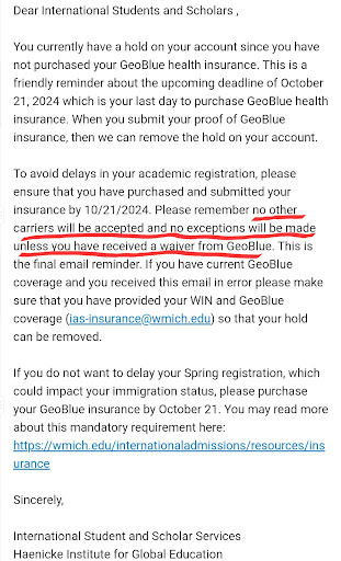 After increasing internasional fees (HIGE) with irrationally huge amount of money, from $25 to $650. They're now forcing us to buy their insurance, GeoBlue, without giving another alternative, which is violating the students' freedom of choice.