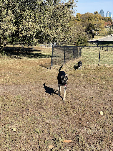 Huge park with plenty of trees, some water stations, poop bag stations and plenty of benches. Unfortunately, this really only describes the big dog area 40 lbs. Small dog area has a bench and shade from 1 nearby tree and the area is super small. So this basically forces everyone with a small dog into the big dog area.