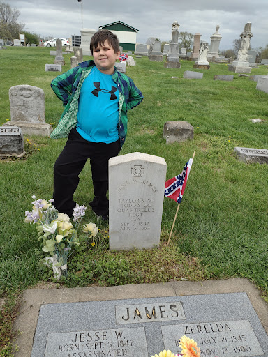 When you get to Mount olivet cemetery his grave is kind of by two pine trees. There was a confederate flag on it when we went. This is his final resting place originally his mom buried him at their cabin just less than 3 mi away from here. There's also a museum there worth a stop! He's buried by his wife Zarelda. And his mother is beside them also named Zarelda on one side of him. The other side is his stepdad and the dad to his half brother, Archie, that died by the "Pinkerton bomb'' that was meant for Jesse. Archie's grave is right...