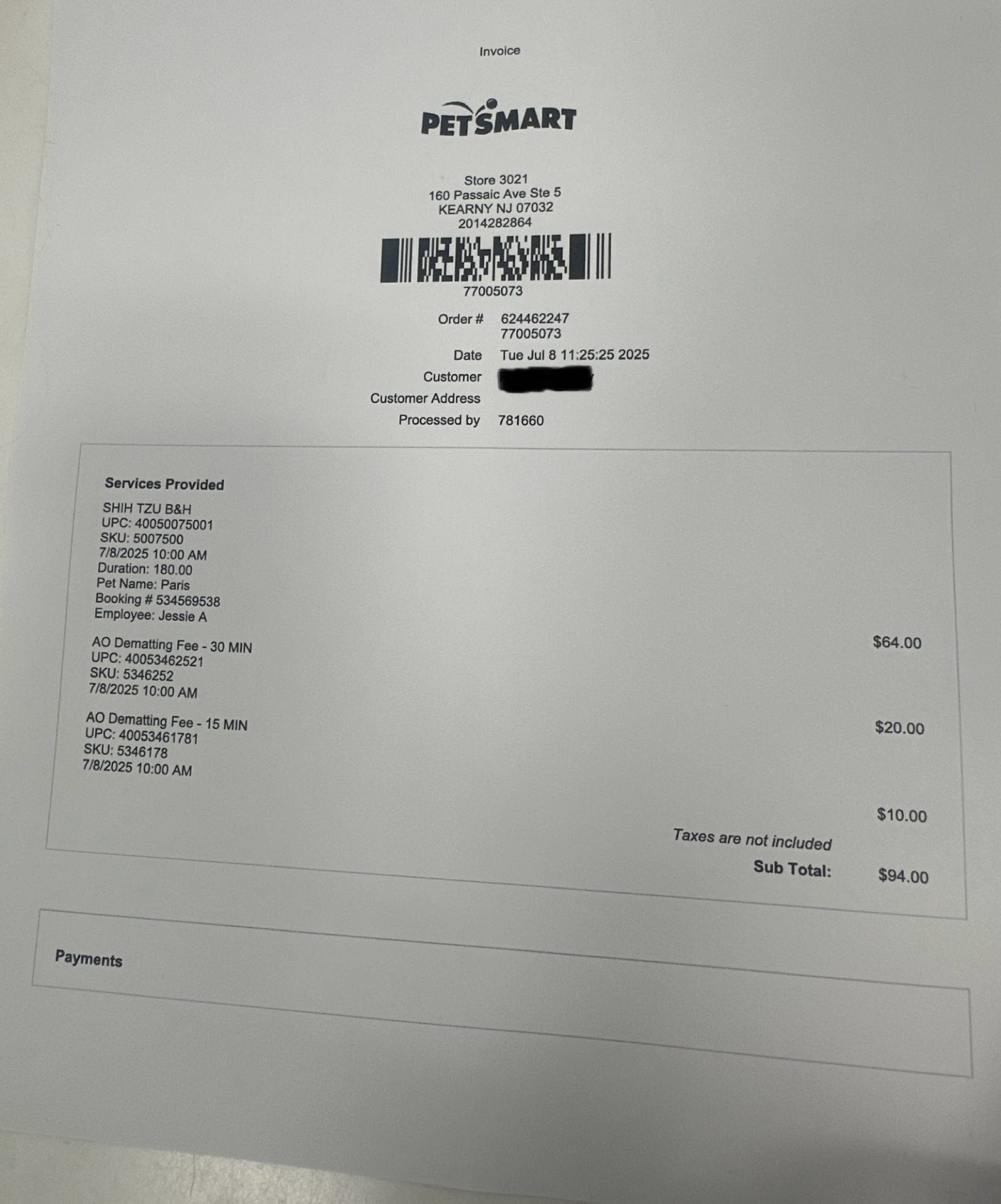 I arrived at PetSmart Kearny at 10:10 for my 10am appointment. My groomer was Jessie. She said my service would be between 3-4hrs. I mentioned that my dog did have some matting, Jessie automatically said I’ll be charged the maximum for the matting. This was before even assessing my dog’s fur. Therefore I was charged a 30min and a 15min dematting fee for a 12lb Shih Tzu/poodle.