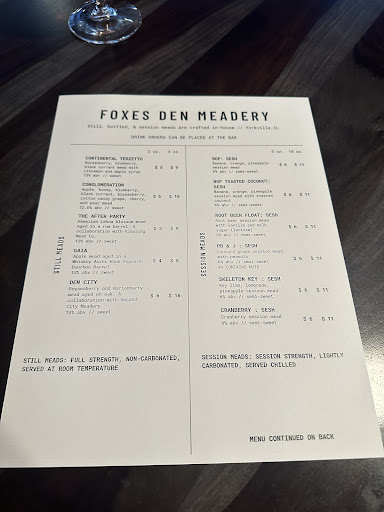 Read moreFoxes Den Meadery is a hidden gem in our local community. From the moment I stepped in, the cozy ambiance and friendly staff made us feel right at home. We hosted our employee Christmas party, and it was a great experience for our team. Rico was beyond accommodating and truly enjoyed our time there. The meads and beverage selections were tasty and fun to try different varieties. Highly recommend Foxes Den Meadery for...