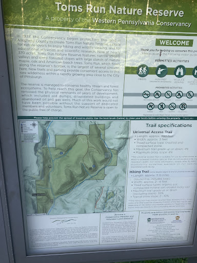 Read moreThis is a great spot to get out and enjoy 300+ acres of wooded area. The 3 mile loop trail is of moderate difficulty. Please be aware that is is a nature reserve and not a municipal park, don't conflate the trail here with a maintained walking path. There are offshoots from the conservancy loop trail that dead end or terminate on private property, when in doubt note that the loop trail is marked by white blazes. Make sure to visit and check the W Pa Conservancy website...