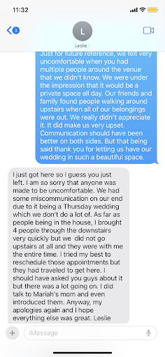 It did not end there. A week later, my husband reached out to Jack, the property manager, to ask about a few missing items we thought might have been left on the property. Jack then informed us that one of our guests had popped a balloon with confetti in it, in the grass, in which he stated we should “bring a vacuum” to clean it up. Once my husband confronted him with the various issues we had that previous week at our wedding, Jack quickly turned the blame to the owner saying that “Leslie is in over his head at times.”