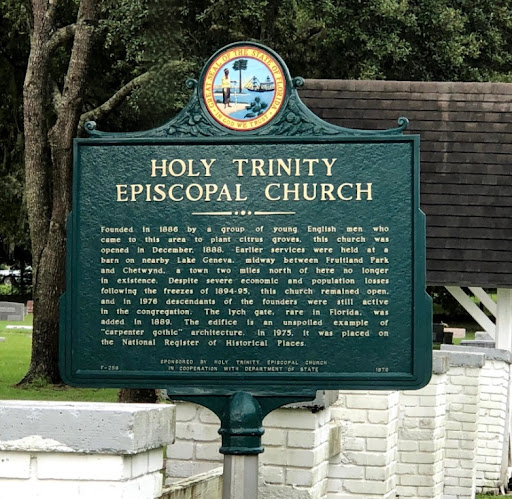 Founded in 1886 by a group of young English men who came to this area to plant citrus groves, this church was opened in December, 1888. Earlier services were held at a barn on nearby Lake Geneva, midway between Fruitland Park and Chetwynd, a town two miles north of here no longer in existence. Despite severe economic and population losses following the freezes of 1894-95, this church remained open, and in 1976 descendants of the founders were still active in the congregation. The lych gate, rare in Florida, was added in 1889. The edifice is an unspoiled example of "carpenter gothic"...