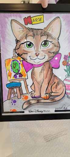 Read moreI had previously had pet cartoons here done of 2 of my pets, but I still needed my third pet drawn. On my next visit, I knew I had to visit this shop here at Disney Springs. They have examples posted around the shop. When you know what you would like to order, you go to the counter to fill out your order form. Know your general theme to give the artists an idea. I came with pictures prepared. You can air drop or text your pictures to them of your pets or ideas. Then your order goes into the queue for drawing. They text you when it is ready, so you can shop around Disney Springs in the meantime. Mine only took about an hour to draw and it was ready! You have some options such as black and white, color, just a face, face and body, and even with a frame if you want. For my first two pet-toons I have my two dogs wearing mickey and minnie hats. For my newest pet-toon, I have my cat in an aristocats theme. It was so cute and colorful! The artists really try and make it creative. If you are looking for something unique, come check out this shop, they have so many other things they can do like draw your name or your own caricature, among other crafts...