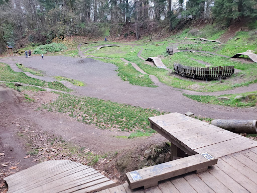 Clean park with nice, clean artificial grass baseball fields. There's a bike park up above on a trail with a track and jumps, and there are play structures for kids near the entrance. Restrooms are clean. Parking lot looks small and tight but we've never had an issue with finding parking there (though a few times it's come close). That said, parking it's right near one of the baseball fields so a foul ball could take out a windshield. There are signs warning of poison oak, so be careful and stay out of the brush. It's a nice park, but if you're not there for the sports fields or the bike track above there are nicer parks...