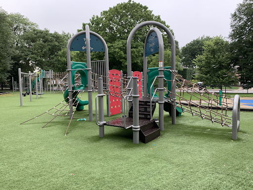 The playground has solid amenities for families as well. There are benches and picnic tables near the play area as well as trees for some shade. The play area is not fully enclosed but is fenced from the street and opens into the rest of the park. The surface is artificial turf - a relative rarity for Chicago Parks! All in all, this is a wonderful and interesting playground;...