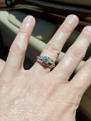 Per usual, Julio was wonderfully accommodating, and where the other shop kept insisting my ring would have to be completely melted down and re-created to be “correct,” Julio assured us all it needed was some routine maintenance. My rings are very nature-inspired, where the center diamond is set in a modified bezel that’s actually a flower, and then the rest of the setting and the two wedding bands are leaves that come up to meet the flower in the middle. Julio was able to adjust the petals of the flower to make the diamond more secure, and in the process, the diamond now gets more light shining through it so it’s even more brilliant than it was before. He also checked all the small accent diamonds, gave my rings a good polish, and gave them a fresh rhodium plating, all in one day. Additionally, Kelsey sent us a detailed appraisal for insurance purposes.
