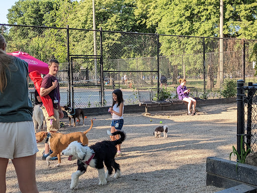It's not great, but it's not awful... This dog friendly area is built like an 'L' around the corner of the tennis courts, so if your dog runs to the other side, you won't be able to see them. The ground is not cement (which is what's common for Chicago Park District dog areas) but instead a mix of soil and woodchips. That's great for their joints if it's dry, but I went after a rainy day and obviously, it was muddy. The fences are not too tall, so if you have a dog who can jump a 4 foot fence, be careful! There is no water fountain, so bring your own bowl - there's a water fountain a short walk away for the rest of the park.