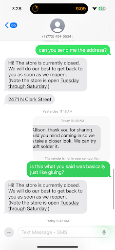 The sudden lack of communication was odd considering how responsive they were when booking the appointment. It gave the impression that they care more about appearances and their reputation than actually helping people with their jewelry or answering honest questions about safe repair options.