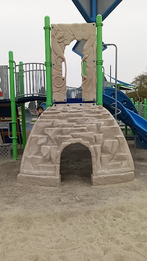 The park has a nice structure, or apparatus, that has some slides, a rock wall, and a little hill, among other things. The most popular item might be the zip line.
