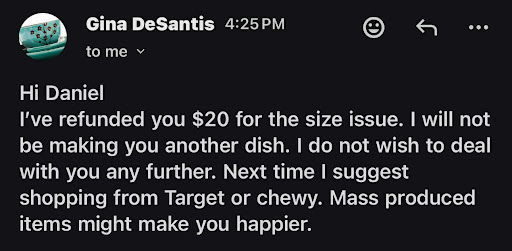 After some searching, I found Gina DeSantis Ceramics, which listed their larger size as 9 inches. I placed an order for a large custom bowl, which cost about $100, and I was very excited—until it arrived. The bowl was actually slightly smaller than 8 inches, closer to their 7-inch medium bowl. I reached out to Gina DeSantis Ceramics about the issue, and their response was a brief: “All sales are final and all sizes are clearly listed. You got what you ordered.”